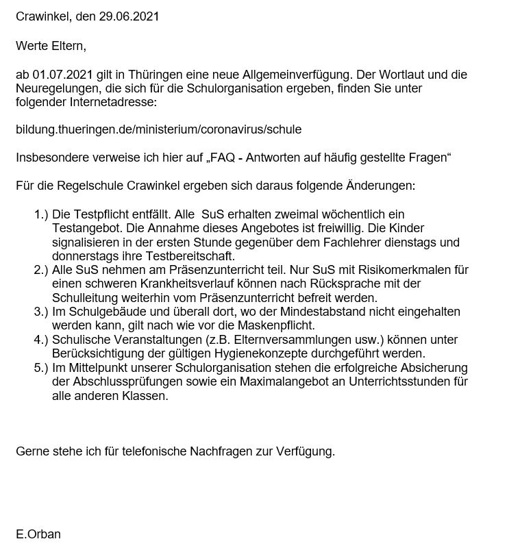 Elternbrief vom 29.06.2021 - RS Crawinkel